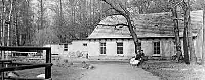 1962 baute die Stadt dieses Gebäude, das als Stall genutzt wurde. Toiletten für die Belegschaft gab es damals übrigens noch nicht. Auf dem Wirtschaftshof wurden Holzschuppen errichtet, die als Werkstatt, Lager und Futterküche dienten. Warmwasser stand nicht zur Verfügung. Die Arbeitsbedingungen waren aus heutiger Sicht mehr als bescheiden. Das Futter wurde in Bottichen gewaschen, per Hand zerkleinert und gestampft. Im Winter fror die Leitung zu, so dass kaltes Wasser herangetragen werden musste. Elektrische Hilfsmittel gab es nicht. Alles, was im Tierpark zu bewegen war, wurde getragen oder geschoben. Noch bis Ende der achtziger Jahre spannte man den Eselhengst bei Schnee vor den Pflug, um die Wege begehbar zu halten.