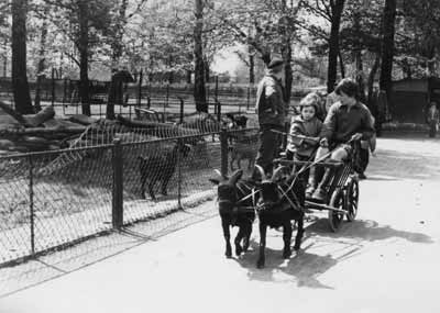 Die schon legendäre Ziegenkutsche fuhr ebenfalls in den Siebziger Jahren. "Weißchen" war ein schwarzer Bock, der mit angespannt wurde und seinen Namen einem kleinen weißen Fellfleck verdankt. Im Alter bekam er dann Sonderrechte. Er durfte sich nämlich frei im Gelände bewegen. Häufig traf man ihn bei seinen "Kontrollgängen" auf den Besucherwegen. Mancher stand ihm dann plötzlich erschrocken gegenüber. Aber Weißchen war die Sanftmut in Person. Als er eines Tages am Tor zum Wirtschaftshof um die Ecke lugte, rief ein kleines Kind: "Mutti, Mutti, da hinten guckt der Teufel!" Nicht selten amüsierten wir uns über die verschiedenen Verhaltensweisen der Besucher. Da stand z.B. Weißchen regungslos auf dem Weg. Manche kehrten sofort um, andere versuchten, im Bogen vorbeizukommen. Wer schließlich kein Kind schneller Entschlüsse war, stand ihm eine Zeit lang Auge in Auge gegenüber. Wehe aber, man knisterte mit einer Tüte! Da gab es für Weißchen kein Halten mehr. So vernahmen wir eines Tages laute Hilferufe aus der Nähe des Affenkäfigs. Zwei junge Damen standen starr vor Schreck auf der Bank, während sich Weißchen den Inhalt ihrer eilig hingeworfenen Tüten einverleibte.