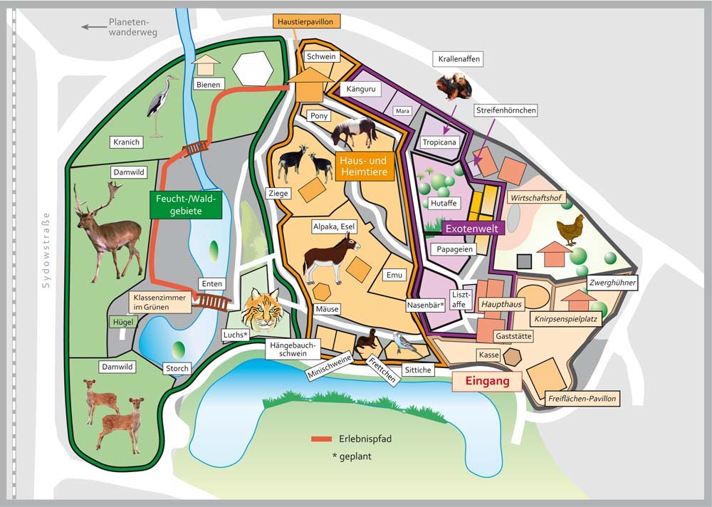 Im hinteren Bereich des Tierparks leben - außer im Bienenhaus - vorzugsweise heimische Wildtiere. Ein schmaler Naturerlebnispfad mit einer Vergleichs-Sprunganlage, Fühlkästen, Balancierstämmen und einer Hängebrücke führt hindurch. Der Besucher blickt auf Damwild, Kranich und Luchs. Außerdem wird auf Tafeln Wissenswertes über Tiere, Natur und ökologische Zusammenhänge vermittelt.