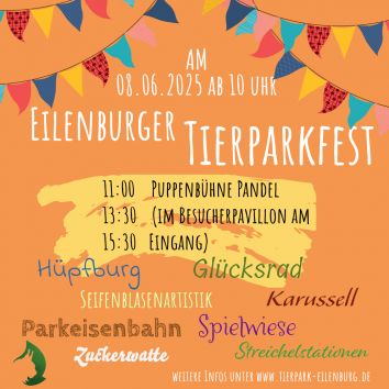 Wir freuen uns auf viele kleine und große Besucher zu unserem traditionsreichen Tierparkfest. Wie schon seit vielen Jahren tanzen die bunten Puppen der Puppenbühne Pandel im Besucherpavillon gleich am Eingang. Unsere Gastronomie sowie unser Zuckerwattestand sorgen für die nötige Stärkung, nachdem die Kinder auf der Spielwiese samt Hüpfburg getobt haben. Natürlich gibt es auch wieder den Kontakt zum Tier bei unseren beliebten Streichelstationen sowie eine kommentierte Fütterung bei unseren Luchsen Malou und Ilvy. Ein wenig Entspannung findet sich vielleicht auch beim "Seifenblasen pusten" - Seifenblasenartist Jörg Müller ist auch mit vor Ort und bringt nicht nur Kinder sondern auch so manchen Erwachsenen zum Staunen. Und wenn dann die Beine langsam müde werden, geht es auf der Parkeisenbahn durch den Tierpark weiter.