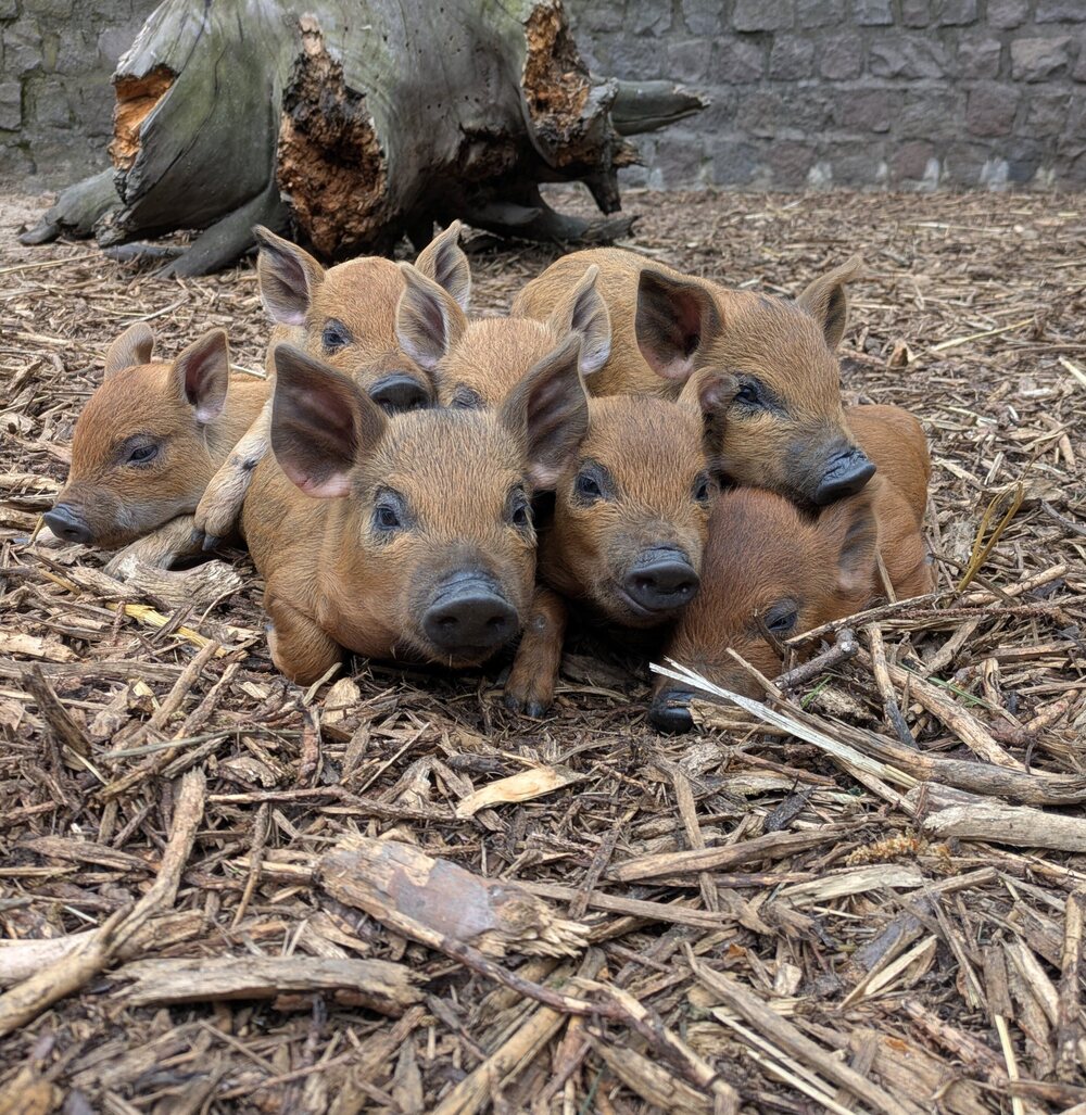 Von vielen schon sehnsüchtig erwartet wurden unsere Wollschweinferkel. Die Tragzeit dieser robusten Haustierrasse beträgt laut Literatur 3 Monate, 3 Wochen und 3 Tage. Da natürlich neben der vorgeschrieben Tragzeit noch einige andere Faktoren eine Rolle spielen, gab es auch trotz eingerechneten Puffer keine Ferkelchen zum Osterfest, sondern eine Woche später. Alles halb so wild - wichtig ist, dass es sowohl Mutter als auch Jungtier gut geht. Und das ist bei allen 10 Ferkeln der Fall und die Muttersauen Kriemhild und Brunhild haben wieder einiges zu tun. Im Gehege flitzen 4 Eber und 6 Sauen mehr umher. Und diese haben die Möglichkeit, sofern sie das wollen, den benachbarten Spielplatz aufzusuchen. Ein absolutes Highlight, da so nun für unseren kleinen und großen Besuchern die Möglichkeit besteht, dem Nachwuchs ganz nah zu kommen und ein Wollschweinferkel auch mal zu streicheln. Und wer kann das schon von sich behaupten? Also nichts wie los - ab in den Tierpark!