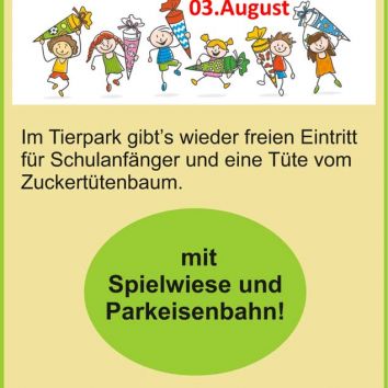 Der Tierpark bittet seinerseits die Schulanfänger um Hilfe: Wenn alle Zuckertüten auch von Oma, Onkels und Freunden leer geräumt sind, diese bitte nicht wegwerfen. Der Tierpark möchte auch im nächsten Jahr den Tierpark wieder ansprechend dekorieren und freut sich insbesondere über kleinere Zuckertüten in gutem Zustand.